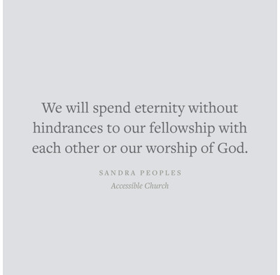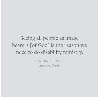 Theologically grounded and deeply practical, Accessible Church will give clear direction to any church that desires to be welcoming and accessible to people with disabilities and their families. I’m grateful for Sandra Peoples’s advocacy on behalf of families like mine and creating ways for all people to experience God’s plans, purposes, and blessings through disability.