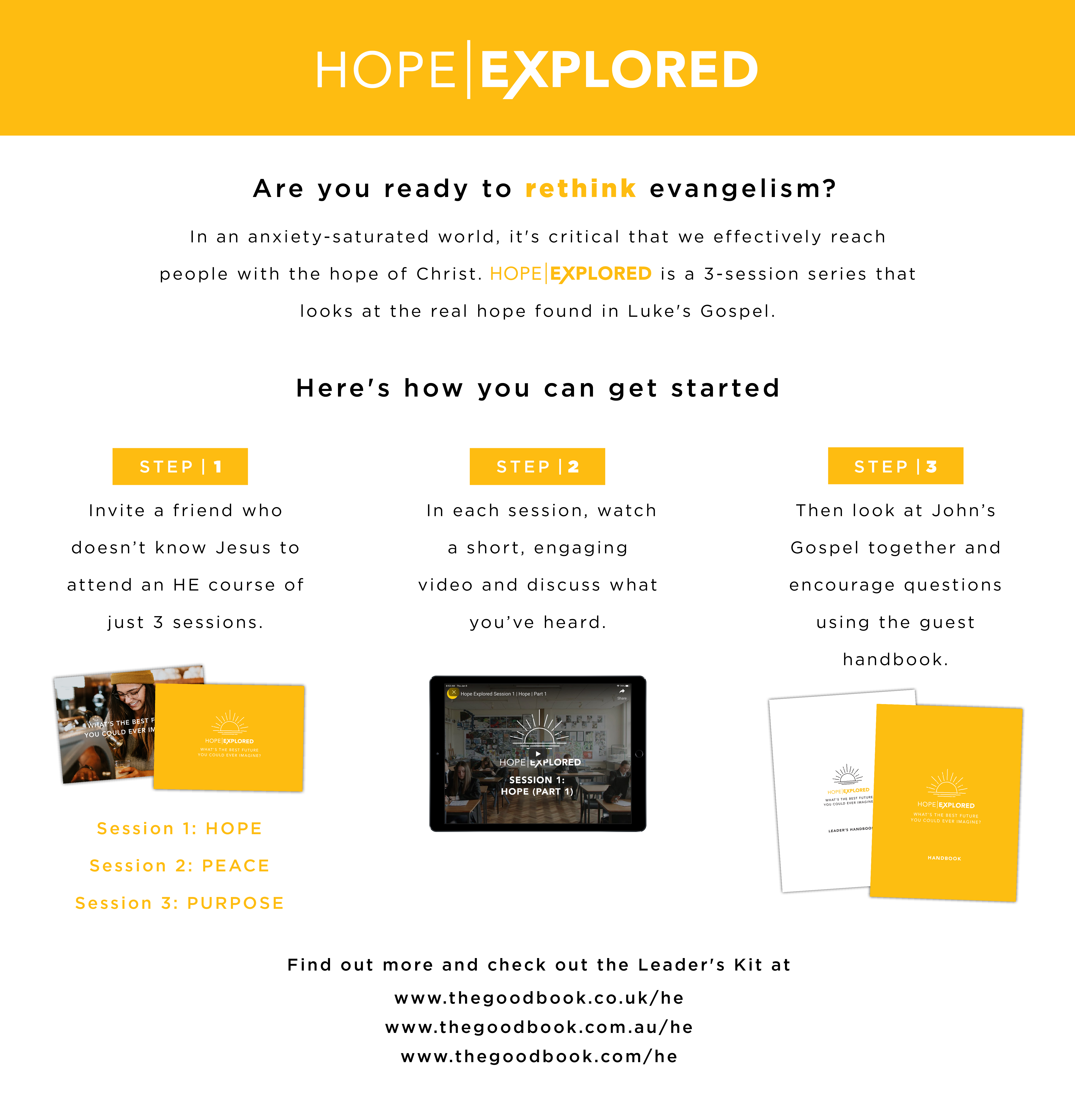 Check out the Leader's Kit, which contains everything you need to run this video-based evangelistic course: a Leader's Guide, a guest handbook, picture cards, a DVD and a code to access video downloads.