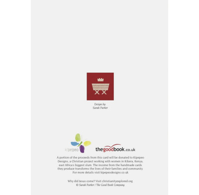 A portion of the proceeds from this card will be donated to Compassion, an international child development organisation. Please note that the charity mentioned on the back of this card, Kipepeo Designs, was wound up in 2016, and so any charitable proceeds are now directed to Compassion.