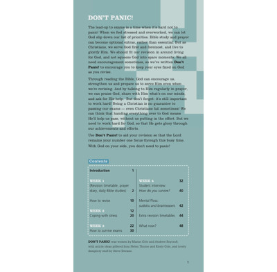Exams are a time of real stress for many Christian students - with loads resting on the outcome of the results. It's a time when most need the re-assurance and guidance that God's Word can give. That's why we've developed Don't Panic - an exam survival guide.