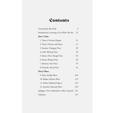 The first 8 chapters address different aspects of time and how it influences our daily lives; whether it’s our busyness, our stage in life, or our memories. The last 4 explore our physical place and presence.