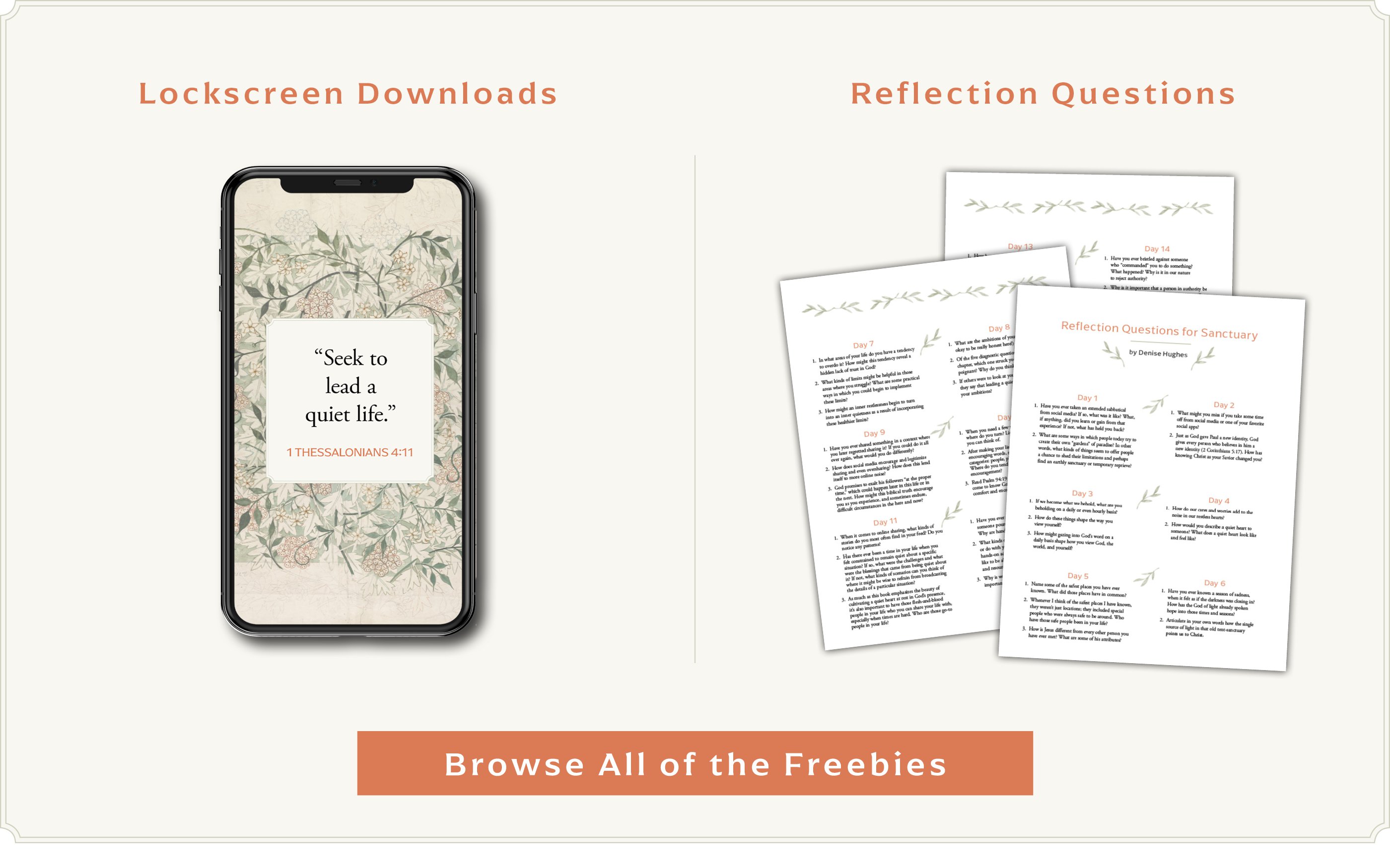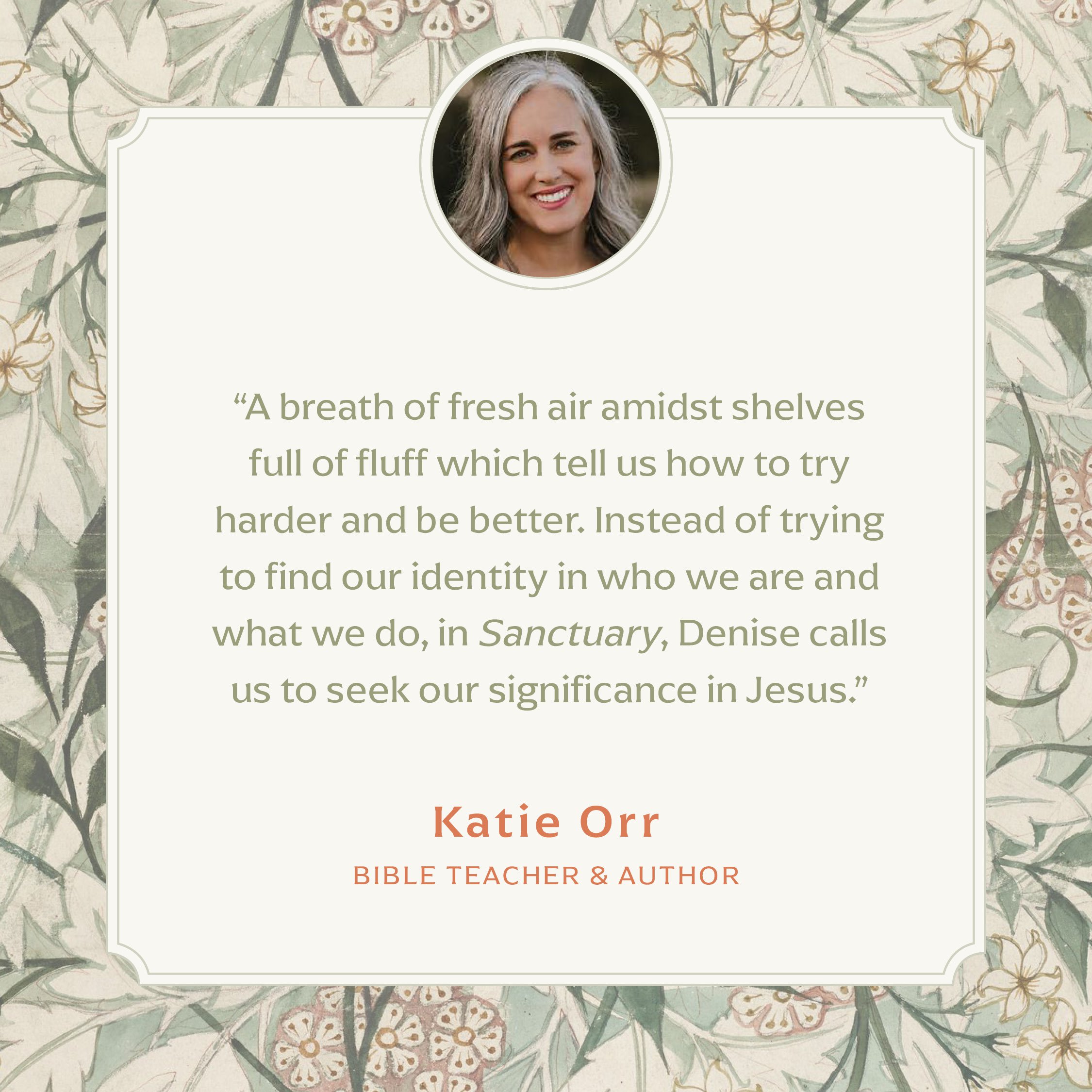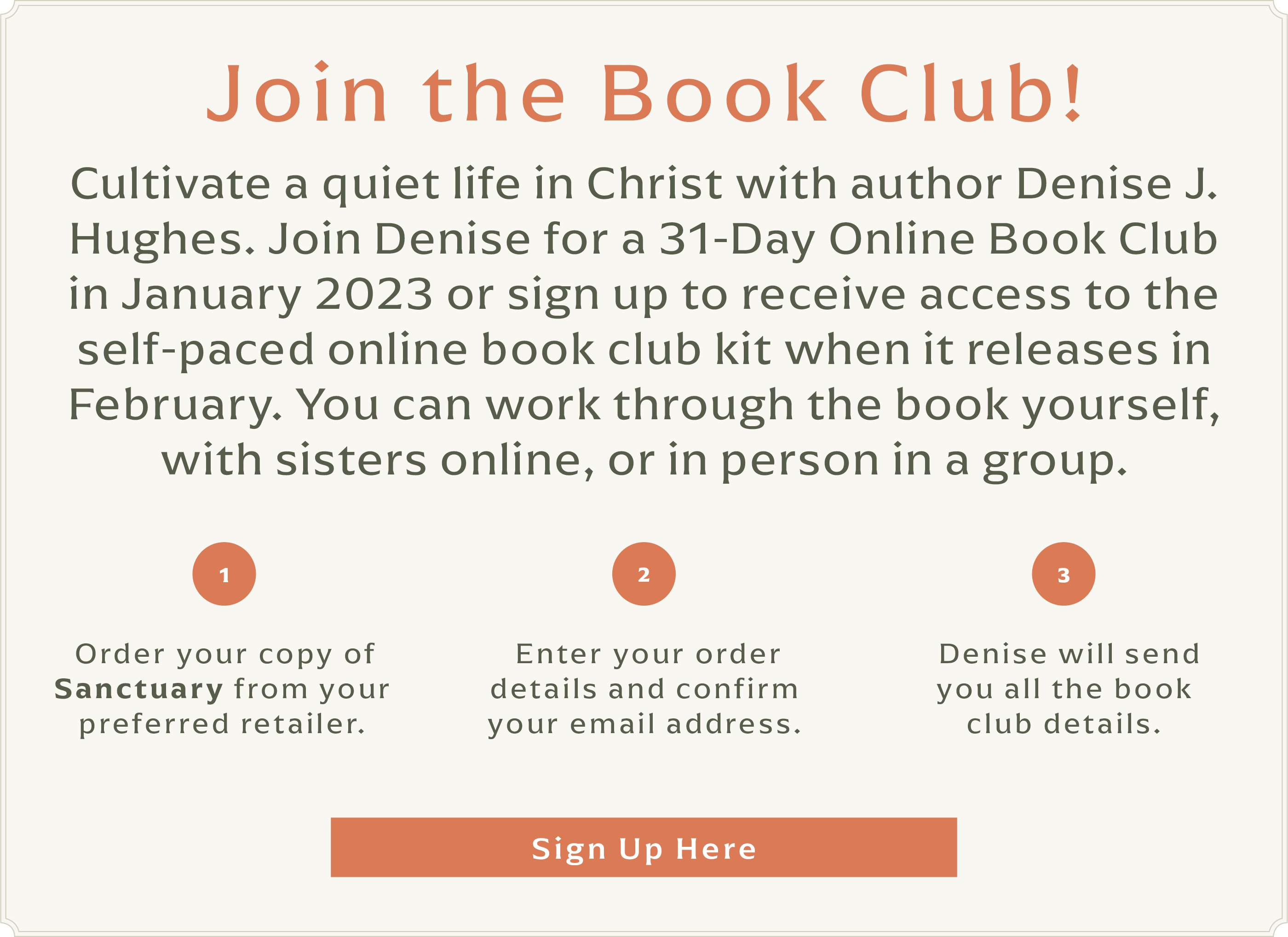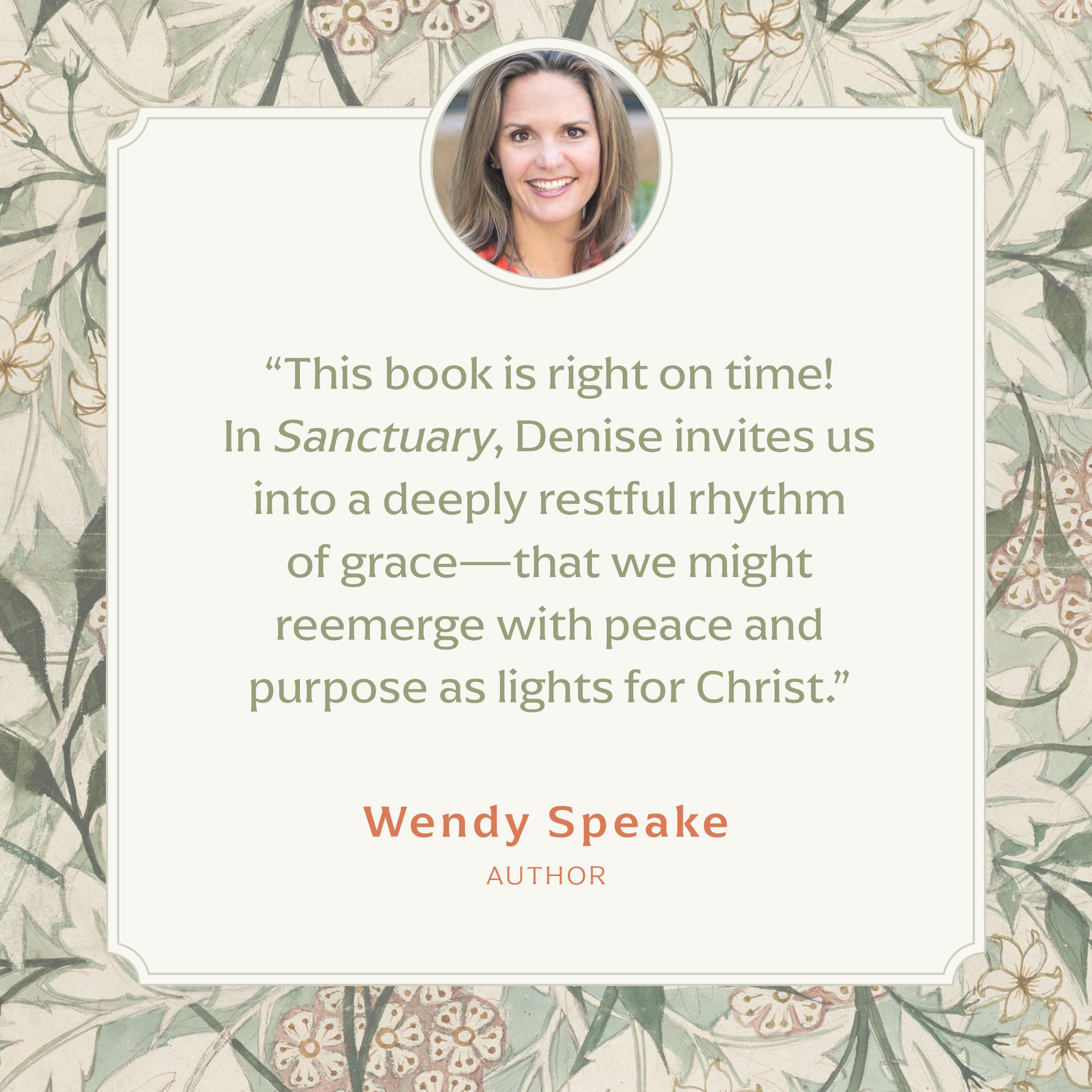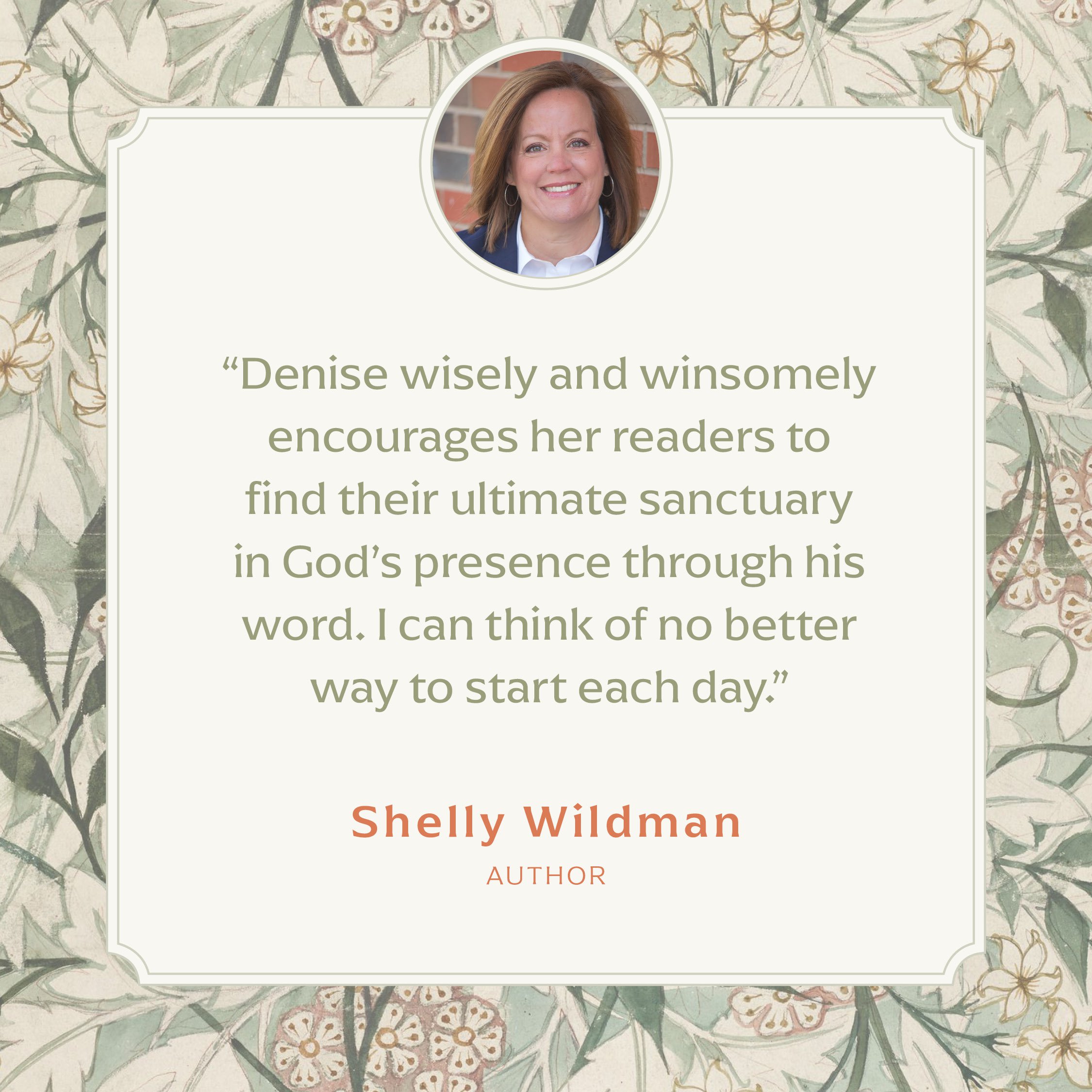 In this warm and engaging 31-day devotional, author Denise J. Hughes encourages her readers to find their sanctuary in Christ. The modern world pulls us in so many directions, and the noise of our culture can overwhelm our minds and hearts. Denise addresses many of the common pressures we face, including social media, comparison, and busyness, and directs us to look to Christ to find peace and joy in the midst of it all. Each day’s devotion includes a biblical reflection, practical ideas for cultivating a quiet heart, questions for contemplation, and a prayer.