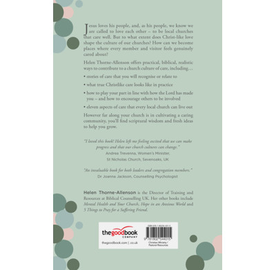 “Developing Christ-like care in our churches serves so many ambitions. It blesses those inside the church who receive that care, and it commends Christ to those outside the church who see the quality of the care being given. Helen Thorne-Allenson’s book is a faithful, biblical and comprehensive guide to the principles and practicalities of being a caring church. Broad in scope yet detailed in application, this book will help all our churches grow the kind of caring culture that is both glorifying and obedient to Christ.”