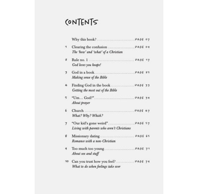 This is a book about God, you, the Bible, prayer, church, relationships, sex, feelings, doubts, love and, above all, hanging in there as a Christian.