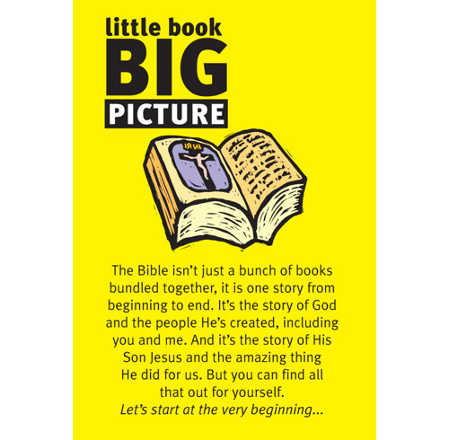 This is a mini Bible overview for children and teens. It follows the Bible story from beginning to end, in 15 colourful pictures. Each page has a short explanation and a Bible reference for looking up. It finishes with a challenge to be part of God's big picture.