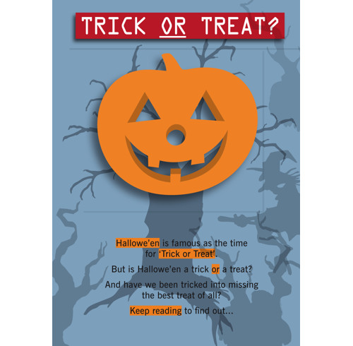 we decided to use the door knocking on Halloween as an opportunity to put the Christian point of view to the children who came. We gave sweets to start with and then handed out the tract. Most door knockers were youngsters accompanied by an adult, so the content was appropriate. It might be too young for teenagers who really need to know about these things, so another version for an older recipient would be welcome. Our previous response to the Trick or treat request has been NO THANK YOU but we think in our present Godless culture any opportunity to put the other side of things needs to be grasped. Do you have anything similar for carol Singers?