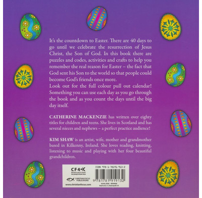 It's the countdown to Easter. There are 40 days to go until we celebrate the resurrection of Jesus Christ, the Son of God. In this book there are puzzles and codes, activities and crafts to help you remember the real reason for Easter - the fact that God sent his Son to the world so that people could become God's friends once more.