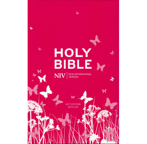 NIV pink Bible with zip and comes in a protective box. Font size 6.75pt