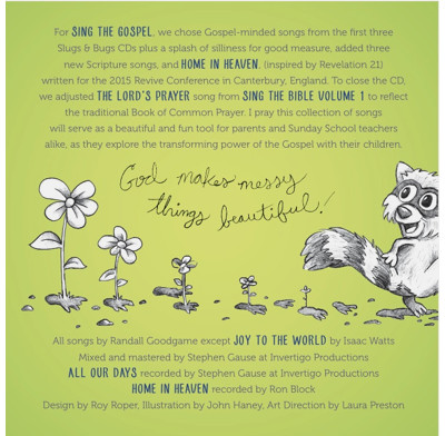 "For Sing the Gospel, we chose Gospel-minded songs from the first three Slugs & Bugs CDs plus a splash of silliness for good measure, added three new Scripture songs, and Home in Heaven, (inspired by Revelation 21) written for the 2015 Revive Conference in Canterbury, England. To close the CD, we adjusted THE LORD’S PRAYER song from SING THE BIBLE VOLUME 1 to reflect the traditional Book of Common Prayer."