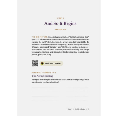 The Biggest Story Family Devotional features 104 Bible stories. Each story includes a brief Big Picture introduction and a Gospel Connection summary to help children understand and apply Scripture. A QR code on each story page links to an animated video retelling that parents and children can watch together. The 104 stories each include 5 individual Bible readings (520 in all) that families can complete whenever they choose—during dinner, before bed, one per day, or several at a time. Each reading has family discussion questions, a prayer, and space for notes.
