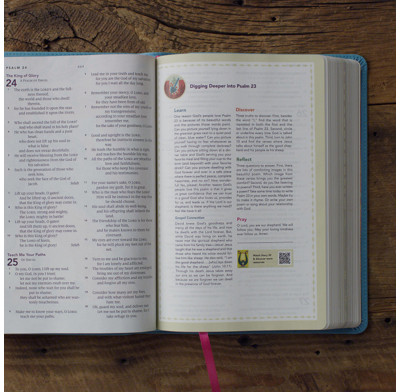 Each book of the Bible opens with a colorful 3-page introduction that includes a summary, timeline, information about the author, character profiles, and more. Near the end of every chapter, “Digging Deeper” sections recap the passage and prompt kids to “Learn, Reflect, Discover, and Pray” about what they’ve just read.