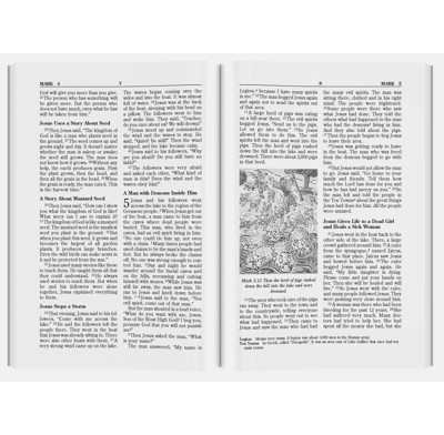 This is an excellent gospel- we used it during the holiday club and then gave one to every child and teenage helper. The print size is good, 1.5 cm margins round pages , modern illustrations on every second page. Lots of bold print headings which breaks up the writing and helps reading. Good quality paper