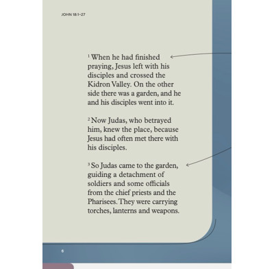 Each double-page displays the Bible text on the left-hand side, supported by helpful notes with background information, questions and answers to explain the passage on the right-hand side. This means that both you and your friend read and chat about the same material together.