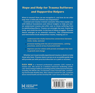 Licensed and trauma-trained counselor Eliza Huie equips you with biblical foundations and clinical insights to help you better understand trauma and offer care to those suffering from its debilitating effects. Trauma can entangle the soul, freeze the body, and cloud the mind. In the face of this struggle, Trauma Aware emerges as an essential resource. This compassionate and informative book demystifies trauma, helping you to