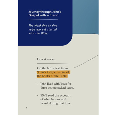 The Word One to One equips you to introduce your friends to Jesus simply by opening up His Word with them. It provides John’s Gospel in an accessible format so that you can read and discuss God’s Word with anyone, anywhere.